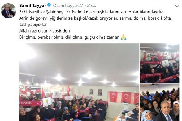AK Parti Gaziantep Milletvekili Şamil Tayyar, Mehmetciğin mücadelesine katkı sağlamak isteyen kadınları ziyaret etti. Tayyar, sosyal medya hesabından yaptığı paylaşım ile kadınların Mehmetçik için kaşkol ve kazak ördüğünü duyurdu. Tayyar, paylaşımında, "Şehitkamil ve Şahinbey ilçe kadın kolları teşkilatlarımızın toplantılarındaydık. Afrin'de görevli yiğitlerimize kaşkol/kazak örüyorlar, sarma, dolma, börek, köfte, tatlı yapıyorlar Allah razı olsun hepsinden. Bir olma, beraber olma, diri olma, güçlü olma zamanı“ ifadelerine yer verdi.