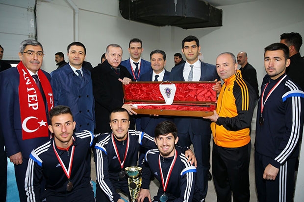 Cumhurbaşkanı Recep Tayyip Erdoğan Gaziantep ziyareti sırasında Karataş Spor Salonunda Avrupa Hokey Şampiyonu Gaziantep Polisgücü Spor Kulüp Başkanı Mehmet Kaplan, Teknik Direktör Yusuf Kasım, Genel Sekreter İsmail Eryoldaşile Hokey Takımı sporcularını kabul etti.