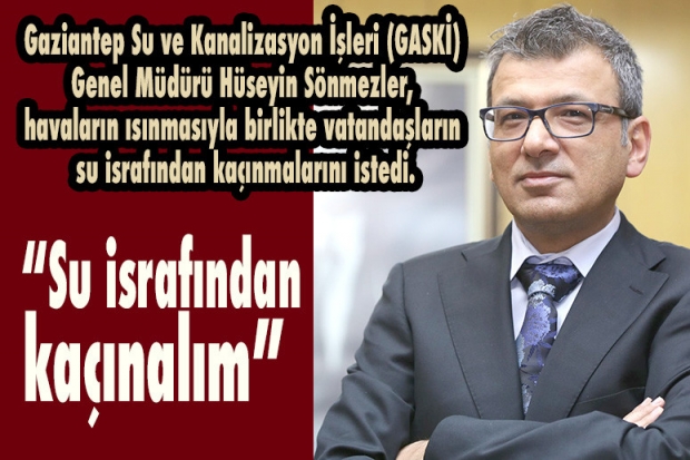 Medeni ülkelerde vatandaşların su israfından kaçındıklarını açıklayan GASKİ Genel Müdürü Hüseyin Sönmezler, abonelerin nasıl olsa parasını ödüyorum diyerek boş yere su sarfiyatına gitmemeleri konusunda uyardı. Sönmezler, “Gaziantep’in su sorunu yok. Fakat sorun yok diye suyu gelişi güzel harcamamalıyız. Havaların ısınmasıyla birlikte su kullanımında yaşanacak artış karşısında sorunumuz yok. Bizler vatandaşlarımızdan suyu boş yere kullanmamalarını istiyoruz. Zira su enerjiyle elde edilemeyecek kadar önemli” dedi.