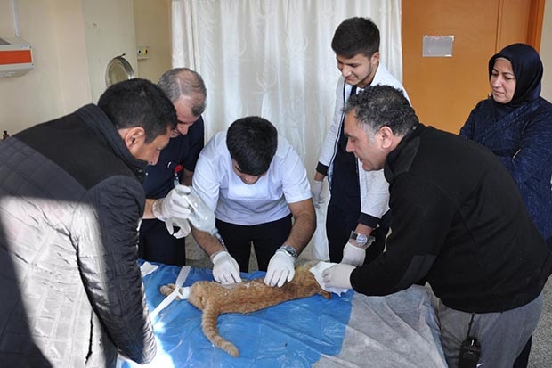 Gaziantep'in Nizip İlçesi'nde, otomobilin çarpmasıyla yaralanan kedi tedavi edildi.