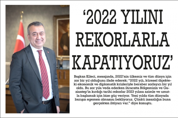 Yeni yıla her anlamda umutlu girdiklerini söyleyen Kileci; “Bizler bu çetin şartlarda birçok şeyi Bölge olarak, Gaziantep olarak başardık. İhracat rekorlarımızla örnek gösterilen bir noktaya ulaştık. Cumhuriyet’imizin 100. yılını kutlayacağımız 2023’te, ihracat hedeflerimizi de bu şanlı asra yakışır şekilde en üst düzeye çıkardık. İhracat ve istihdamla gelişen ülkemize katkı sunmak için her zamanki gibi çalışmaya ve üretmeye devam edeceğiz. Atatürk’ün bize emanet ettiği Cumhuriyet’in 100. Yılını kutlarken bizler de asra bedel rekorlarla buluşmayı diliyoruz. Her yönüyle yeni yılda yerli ve milli bir Türkiye hedefine asırlık Cumhuriyet’imizin verdiği güçle emin adımlarla ilerliyoruz. 2023 yılında yürüteceğimiz fuar katılımları ile sektörel ticaret heyetleri ve alım heyetleri ile eğitim organizasyonları ile ihracatçımızın yanında olmaya devam edeceğiz.” ifadelerini kullandı.