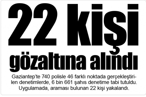 Gaziantep'te huzur ve güven ortamının devamının sağlanması, başta asayiş ve terör olayları olmak üzere suç işlemesinin önlenmesi, aranan şahısların yakalanması amacıyla 98 ekip ve 740 personel ile huzur uygulaması yapıldı. Kentteki 46 farklı noktada gerçekleştirilen denetimlerde; faaliyet gösteren araç kiralama şirketleri, oteller ve günübirlik evlerin de kontrolü gerçekleştirildi. "Huzurlu Sokaklar ve Terör Suçları" uygulamasında 6 bin 661 şahıs sorgulanırken, çeşitli suçlardan aranan 22 şahıs yakalanarak adli mercilere teslim edildi. Toplamda bin 723 aracın kontrol edildiği denetimlerde, 2918 sayılı Karayolları Trafik Kanunu'nun çeşitli maddelerini ihlal ettiği tespit edilen 59 sürücü ve araç plakasına cezai işlem uygulandı, 27 araç ise trafikten men edildi.