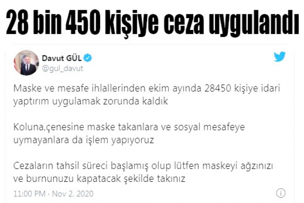 Vali Gül, yaptığı açıklamada, ''Maske ve mesafe ihlallerinden ekim ayında 28450 kişiye idari yaptırım uygulamak zorunda kaldık. Koluna, çenesine maske takanlara ve sosyal mesafeye uymayanlara da işlem yapıyoruz. Cezaların tahsil süreci başlamış olup lütfen maskeyi ağzınızı ve burnunuzu kapatacak şekilde takınız” ifadelerini kullandı.