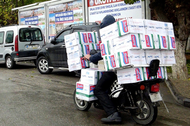 Gaziantep'te motosiklet üzerinde 40 koli makarna taşıyan Suriyeli genç görenleri hayrete düşürdü.