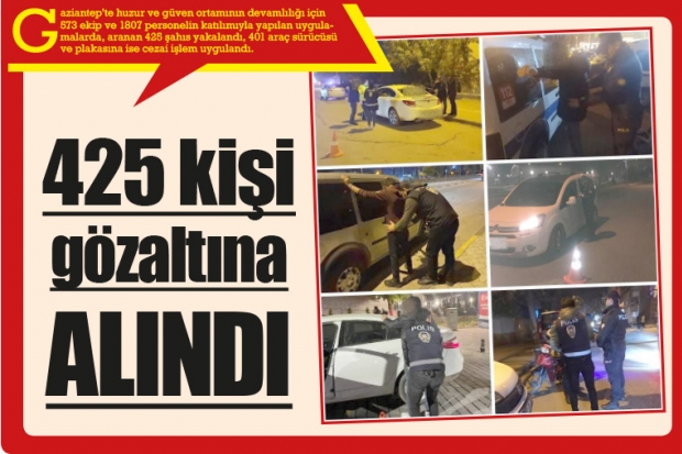 Gaziantep’te huzur ve güven ortamının devamlılığı için 573 ekip ve 1807 personelin katılımıyla yapılan uygulamalarda, aranan 425 şahıs yakalandı, 401 araç sürücüsü ve plakasına ise cezai işlem uygulandı.