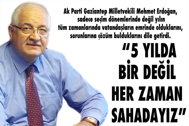 Cumhur başkanı ve Ak Parti Genel Başkanı Recep Tayyip Erdoğan’ın partili milletvekillerine ve teşkilatlarına yönelik, “Saha çalışmalarına önem verin” açıklamasının ardından milletvekilleri ile partili teşkilatların saha çalışmalarına hız verildi. Ak Parti Gaziantep Milletvekili Mehmet Erdoğan, “Cumhurbaşkanımızın talimatları doğrultusunda sadece seçimden seçime değil her zaman sahada vatandaşlarımızın sorunlarına çözüm arıyoruz” diye konuştu.