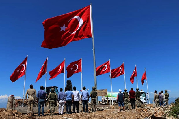Türk Silahlı Kuvvetleri'nin Suriye'nin Afrin kentinde terör örgütlerine yönelik yürüttüğü 'Zeytin Dalı Harekâtı'nda 9 şehit verilen Keltepe'ye, 9 Türk bayrağı dikildi.