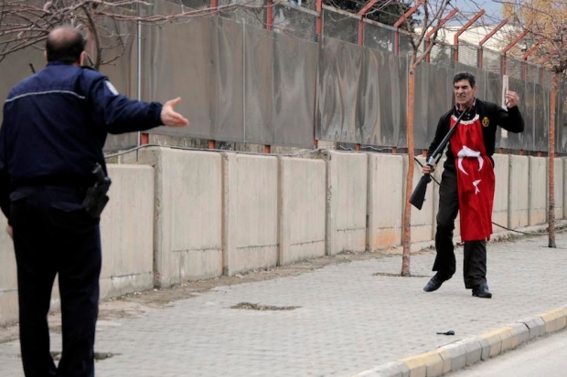 Gaziantep'te boynuna Türk bayrağı asıp maddi sıkıntıları olduğunu söyleyerek adliye önünde av tüfeğiyle intihar girişiminde bulunan 55 yaşındaki Abdulkadir T., polis tarafından ikna edildi.