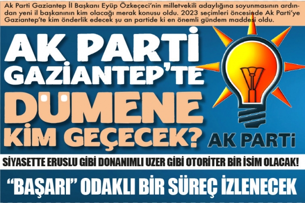 Seçim hazırlıklarına saha çalışmalarıyla hızlı bir başlangıçta bulunan Ak Parti Gaziantep teşkilatları, bu süreçte yeni il başkanının belirlenmesine yönelik hamleleri hzılandırdı. Yeni il başkanının belirlenmesinde teşkilatların öncesinde belediye başkanları, milletvekilleri ile genel merkez yöneticilerinin yoğun bir çalışma temposu içerisinde oldukları açıklandı. 2023 seçimlerinde Gaziantep'i kaybetmek istemeyen Ak Parti Genel Merkezi çalışmalarını bu doğrultuda sürdürüyor.