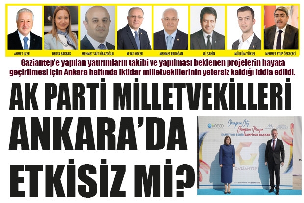 Gaziantep için projelerin hızlandırılması için bakanlıklarda Vali Davut Gül ise Başkan Şahin’in son aylarda daha etkin olduğu ortaya çıktı. Ak Parti milletvekillerinin kente yapılan veya yapılacak olan çalışma ve projelerde etkisiz olmaları parti kulislerinde uzun süredir konuşuluyor. Ak Parti Gaziantep İl Başkanı Eyüp Özkeçeci’nin yaşanan süreç karşısında çaresiz kaldığı ve milletvekilleri üzerinde etkisiz kaldığı ise bir diğer iddia. Gaziantep’te son dönemde en çok tartışılan Şehir Hastanesi Projesinin henüz tamamlanamamasında ise kentin milletvekillerinin etkisizliği konuşuluyor. Hastane projesinin tamamlanamaması nedeniyle Ak Partili kadrolar kentte yoğun eleştirilere maruz kalıyorlar.