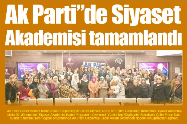 AK Parti Genel Merkez Kadın Kolları Başkanlığı ile Genel Merkez Ar-Ge ve Eğitim Başkanlığı tarafından Siyaset Akademisi'nin 20. döneminde “Siyaset Akademisi Kadın Programı” düzenlendi. Gaziantep Büyükşehir Belediyesi Çetin Emeç Salonu’nda 3 haftalık süren eğitim programında AK Parti Gaziantep Kadın Kolları birbirinden değerli konuşmacıları ağırladı.