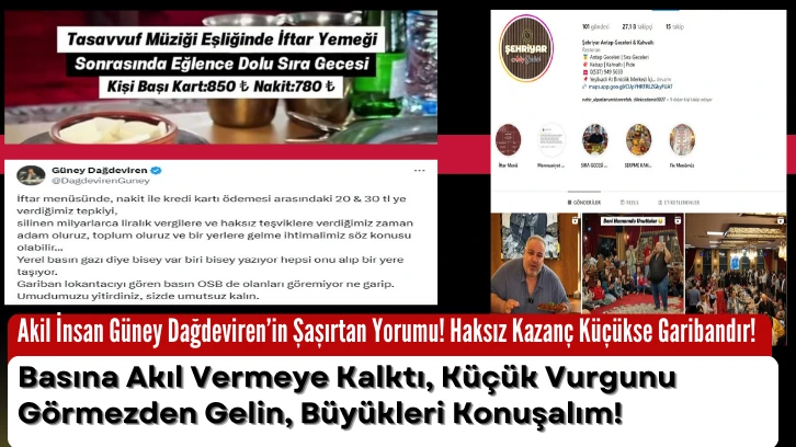 Dağdeviren, sosyal medya hesabından yaptığı paylaşımda, @ sehriyarantepgecelerirestoranın uyguladığı fiyat farkına gösterilen tepkiyi küçümseyerek, basını eleştirdi. Kendisi, milyonlarca liralık vergi affı ve teşviklerin tartışılmasını önerirken, 20-30 TL’lik haksız uygulamaların görmezden gelinmesini savundu.