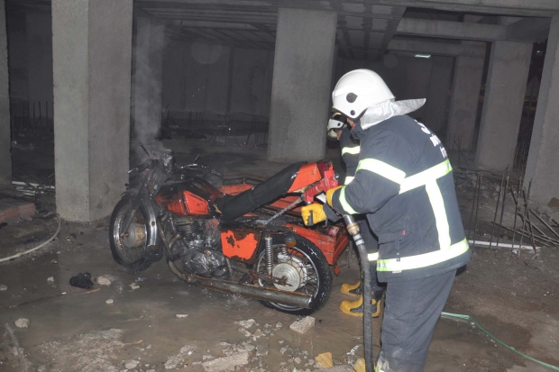 GAZİANTEP’in İslahiye İlçesi’nde, inşaat halindeki binanın altında park halindeyken yanan motosiklet itfaiye erleri tarafından söndürüldü.