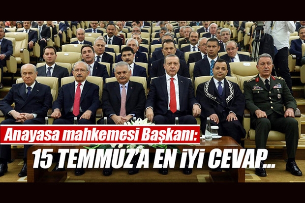 Anayasa Mahkemesi Başkanı Arslan, konuşmasında şunları kaydetti: 15 Temmuz Türkiye'nin darbeler tarihinin kırıldığı bir gün olacaktır. Olağanüstü Hal hukuksuzluk değildi. Özgürlük ve güvenlik birbirini tamamlayan değerlerdir. Adalet mültün temelidir. Sayın Cumhurbaşkanım, 15 Temmuz siyasi tarihimizin en büyük krizlerinden biridir. 15 Temmuz sonrası oluşan birlik biz düşüncesini yeniden inşa etmiştir. Bu anlayışla 15 Temmuz'da bir kez daha hortlayan darbeci zihniyete verilecek en iyi mesaj yeni bir anayasa yapmaktır. 15 Temmuz sonrası oluşan ortam yeni bir anayasa için gerekli zemini hazırlamıştır. 15 Temmuz'a demokratik ve özgürlükçü bir anayasa ile cevap verilmeli. 15 Temmuz anayasanın başlangıç kısmını daha anlamlı bir hale getirdi. Hiçbir anayasa, demokratik anayasal düzeni ortadan kaldırmaya kasteden eylemler karşısında kayıtsız kalamaz. Modern demokratik anayasaların neredeyse tamamında bu tür durumlarda temel hak ve özgürlüklerin daha fazla sınırlanmasına izin veren olağanüstü yönetim usulleri öngörülmüştür. Bunun nedeni olağanüstü rejimlerin temelinde 'zaruret' olgusunun bulunmasıdır. Devlet ve milletin varlığına yönelik ağır tehditler hiç kuşkusuz bir zaruret hali oluşturur.