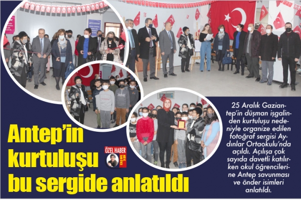 Gaziantepli Araştırmacı-Yazar Bilge Kazaz’ın arşivinden derlenen fotoğraflar “Fotoğraflarla Gaziantep’in Kurtuluşu” adıyla Aydınlar Orta okulu’nda açıldı. Açılış törenine SANKO Holding vakfı Genel Sekreteri Naci Boran, Tekin Özgül, Esin Özgül, Hakimiyet Gazetesi Yazı İşleri Müdürü Gazeteci Sabiha Kocaman ile Aydınlar Okulu Müdürü İlhan Gök katıldı. Okul öğrencilerinin büyük beğenisini kazanan serginin hafta sonuna kadar açık olacağı dile getirildi.