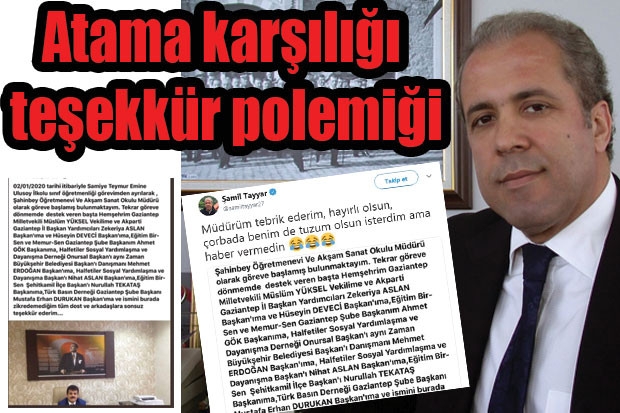 Ak Parti Gaziantep eski Milletvekili Şamil Tayyar sosyal medya hesabından, “Müdürüm tebrik ederim, hayırlı olsun, çorbada benim de tuzum olsun isterdim ama haber vermedin” dedi. Tayyar’ın paylaşımın ardından gözler Gaziantep Şahinbey Öğretmenevi ve Akşam Sanat Okulu Müdürlüğüne atanan Hüseyin İnal’a çevrildi.