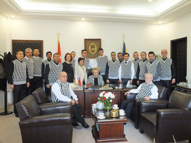 Okul öğretmenleri giydikleri kazaklarla makamında ziyaret ettikleri GKV Mütevelli Kurulu Başkanı Nüket Ersoy ve Yönetim Kurulu Başkanı Celal Ersoy’la Atatürk kıyafetleri konusunda sohbet ettiler.