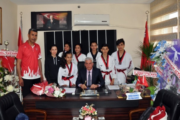 Başarı sporcular ve antrenörleri daha sonra İlçe Milli Eğitim Müdürlüğüne atanan Mustafa Çetin'i makamında ziyaret etti.