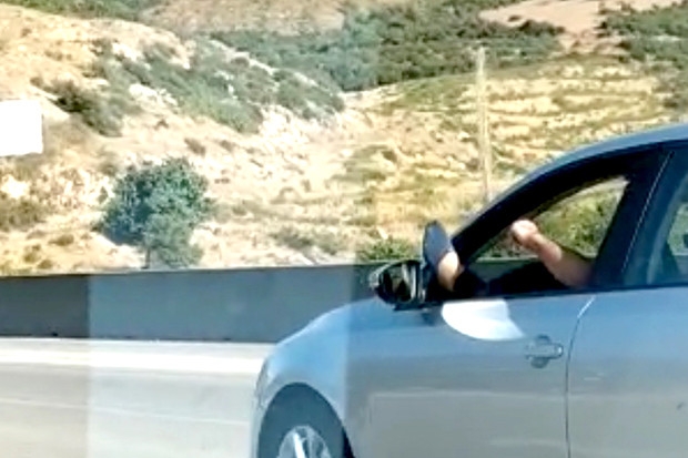 Osmaniye – Gaziantep otoyolunda seyir halinde bulunan bir otomobilin ön camından ayağını sarkıtarak yolculuk yapan sürücünün görüntüleri amatör kameraya yansıdı.