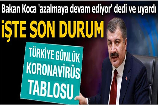 Son dakika haberine göre Fahrettin Koca corona virüs tablosunu açıkladı. Türkiye'de son 24 saatte 1158 kişiye yeni tip corona virüs (Covid-19) tanısı konuldu, 31 kişi hayatını kaybetti, toplam vaka sayısı 150 bin 593 ve can kaybı 4 bin 171 olurken, 1615 kişinin daha iyileşmesiyle Kovid-19 tedavisi tamamlananların sayısı 111 bin 577'ye ulaştı.