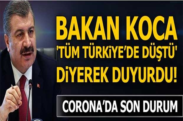 Sağlık Bakanı Fahrettin Koca Türkiye'nin günlük corona virüs tablosunu açıkladı. Türkiye'de son 24 saatte 1172 kişiye Covid-19 tanısı konuldu, 16 kişi hayatını kaybetti, toplam vaka sayısı 239 bin 622, can kaybı 5 bin 829 oldu. Son 24 saatte 1082 kişinin daha iyileşmesiyle covid-19 tedavisi tamamlananların sayısı 222 bin 656 oldu.Öte yandan Bakan Koca, "Zatürre oranı tüm Türkiye’de düştü" açıklamasında bulundu.