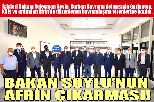 İçişleri Bakanı Süleyman Soylu Kurban Bayramı’nda bir dizi gezi ve ziyaretlerde bulunmak üzere Gaziantep, Kilis ve Suriye’nin Afrin kentine gitti. Bakan Soylu’yu Gaziantep’te, Gaziantep Valisi Davut Gül, Milletvekilleri ile diğer protokol üyeleri karşıladı. Bir süre Vali Gül’den Gaziantep’te bakanlığını ilgilendiren konularda bilgi alan Bakan Soylu, Ak Parti Gaziantep Milletvekilleri ile sohbet etti.