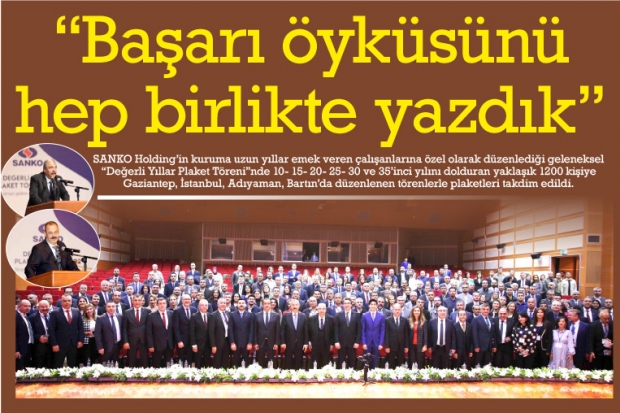 SANKO Holding’in kuruma uzun yıllar emek veren çalışanlarına özel olarak düzenlediği geleneksel “Değerli Yıllar Plaket Töreni”nde 10- 15- 20- 25- 30 ve 35’inci yılını dolduran yaklaşık 1200 kişiye Gaziantep, İstanbul, Adıyaman, Bartın’da düzenlenen törenlerle plaketleri takdim edildi.