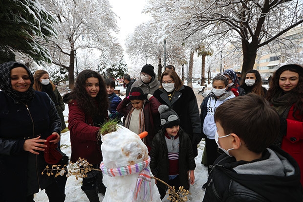 Park ve bahçelerdeki banklardan kaldırımlara kadar kontrol yapan Şahin, karla mücadelenin özveriyle yürütüldüğünü gördükten sonra ise karın keyfini çıkardı. Eldivenlerini giyen Şahin, Celal Doğan Parkı'nda bulunan çocuklar, aileleri ve polis ekipleri ile kar topu savaşı yaptı. Çocuklar ve polislerle doyasıya kar topu oynayan Başkan Şahin, yapılan bir kardan adamı da dikkatlice izledi. Şahin, alanda bulunan bir çocuk tarafından kardan adamın yapıldığını görünce ise çocuğa tablet sözü verdi.