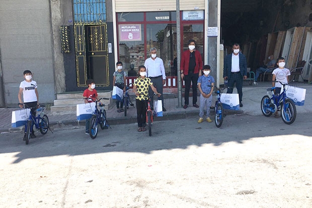 Öte yandan çocuklarda pandemiye karşı hassasiyet oluşturmak adına verilen bisiklet sözünün yanında tişört ve termos bardak da hediye edildi.