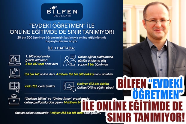 Bilfen Okulları anaokulundan liseye kadar toplam 88 okul, bin 153 şubedeki yaklaşık 20 bin 500 öğrenci ile uzaktan eğitim faaliyetleri devam ediyor. 3 hafta süre içerisinde sadece ilköğretim kademesinde 92 bin 640 online ders işlendi. Offline eğitim için bin 263 video hazırlanıp öğrenciler tarafından 2 milyon 163 bin 301 kere tüketildi. Bin 211 ders ve konu kazanım videosu öğrencileri kullanımına sunuldu. Yapılan eşzamanlı online sınavlarda 541.636 soru çözümü gerçekleşti ve sonuçlar öğrencilerle paylaşıldı. 8. Sınıflarımızdaki 1.934 öğrenci velimize “Merkezi Sınav (LGS) Başvuru İşlemleri” konulu sunum ve “Sınava Doğru Aile İlişkileri ve iletişim” konulu online seminer verildi.