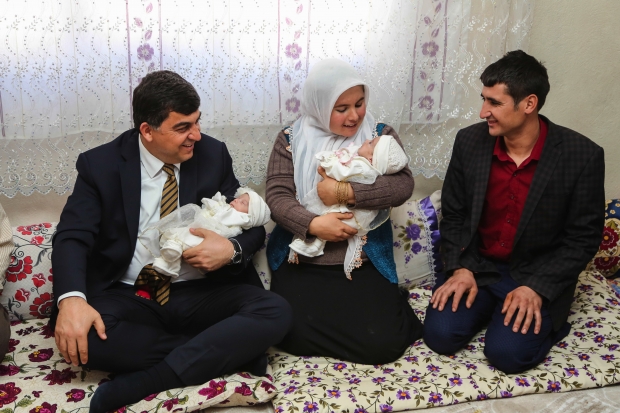 Başkan Rıdvan Fadıloğlu’nun ziyaretinin kendilerini çok mutlu ettiğini ifade eden baba Seyit Bilici, bebek sevinci yaşamak için 3 sene beklemek zorunda kaldıklarını söyledi. Seyit Bilici, “Kızlarımızın ismini; Elif, Şeyma, Rümeysa, Zeynep koyduk. Çok mutluyuz. Bu sevinci çocuğu olanlar iyi bilir. Çok şükür bebeklerimiz sağlıklı. Genellikle anne çocuklara bakıyor. 3 sene çocuğumuz olmadı. Çocuğumuzun olması için tedavi olduk. Dördüz bebeğimiz olacağını duyduğumuzda çok şaşırdık, sevindik. Allah, çocuğu olmayanlara da bu mutluluğu yaşamayı nasip etsin. Başkanımıza çok teşekkür ederiz. Bizi bu mutlu günümüzde ziyaretiyle daha da mutlu etti” açıklamasında bulundu. İlk çocuklarının dördüz olmasından dolayı çok mutlu olduğunu kaydeden Ayşe Bilici, “Çocuk sahibi olmak çok güzel bir duyguymuş. Çok sevindik. Evimize bir mutluluk, huzur geldi. Allah, çocuğu olmayanlara da çocuk sahibi olmayı nasip etsin. Çocuklarıma bakmak bana hiç zor gelmiyor. Pek zorluklarını görmüyorum. Bebeklerimi çok seviyorum. Biri çok yaramaz. Kucağa alışmış. Çocuklarımın isimlerini ilk günlerde karıştırıyordum. Şimdi artık karıştırmıyorum. Şimdi onları tanıyabiliyorum. Yardımlarından dolayı Başkanımıza çok teşekkür ederim. Başkanımızın evimize gelmesi bizi çok sevindirdi” ifadelerini kullandı.
