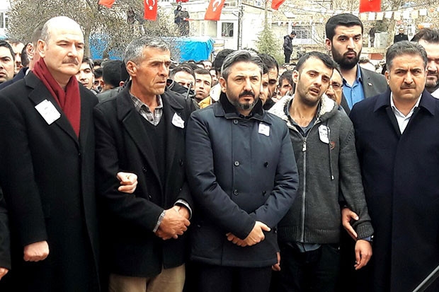 Zeytin Dalı Harekatı'nda şehit düşen Piyade Uzman Çavuş Enes Sarıaslan'ın Adıyaman’daki cenaze törenine katılan İçişleri Bakanı Süleyman Soylu, şehit babasının kolundan hiç ayrılmadı.