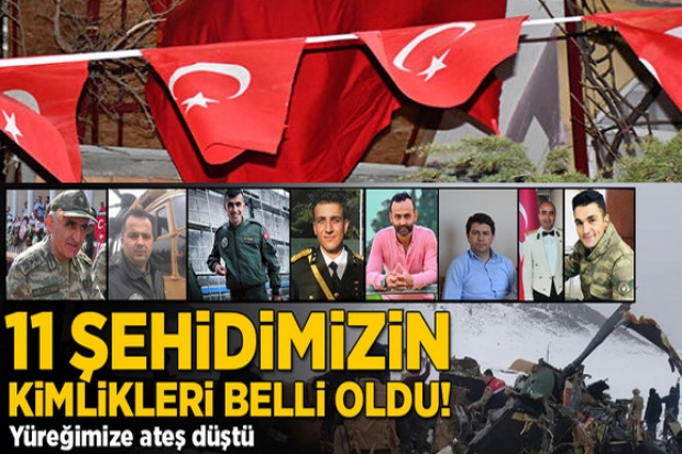 Türkiye, Bitlis'ten gelen haber ile kahroldu. Bingöl'den kalkan askeri helikopterin kaza kırıma uğradığı olayda 11 askerimiz şehit oldu. Şehitlerin isimleri belli oldu. Kahreden helikopter kazasından yaralı olarak kurtulan 2 askerimizin de kimlik bilgileri belirlendi. Şehit olan askerlerimizden birinin Elazığ'daki 8'inci Kolordu Komutanı Korgeneral Osman Erbaş'ın olduğu öğrenildi. Erdoğan sosyal medyadan yaptığı paylaşımda, "Kahraman şehitlerimize Allah’tan rahmet, yaralılarımıza acil şifalar diliyorum. Kederli ailelerinin ve aziz milletimizin başı sağolsun" ifadelerini kullandı.