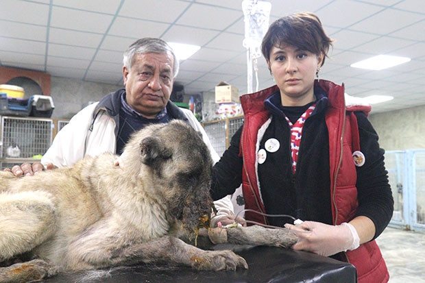 Gaziantep'te tedavi edilen zavallı köpeğe ilk müdahaleyi yapan ve günlerdir onunla ilgilenen Veteriner Hekim Esra Taşkın, "Bize bir ihbar geldi. Cahide Derneği'nden Cemal Bey gidip Osmaniye'den köpeği getirdi. Geldiğince durumu çok kötüydü köpeğin. Nefes dahi alamıyordu ve hala da öyle nefes almakta zorlanıyor hayvan. Canice bir şiddet olayı bu. Kendi kendine oluşması mümkün değil bunun. Sert bir cisim yada bir kaza sonucu oluşan bir şey değil bu. Anladığımız kadarıyla bilerek isteyerek yapılmış bir insan şiddeti bu. Zavallı hayvanın yüzüne kimyasal yakıcı bir madde dökülmüş. Yani kezzap, asit yada ve benzeri bir madde olabilir" dedi.