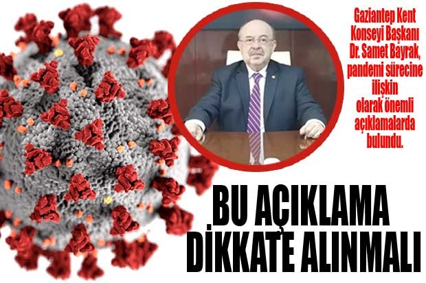 Gaziantep Kent Konseyi Başkanı Dr. Samet Bayrak, “Okulların açılmasının kesin kriterlere bağlanması gerekir. (ABD örneği) Türkiye de hiç değilse okulları daha güvenli ortamda açabilmek için günde 100.000 test yapılması, kesin bilgiler ve tarih vermek durumundayız. Okulları açalım, hangi durumda kapatırız bakarız, şeklinde bir yaklaşım güven vermeyecektir. Binden 900’e inmek ne kadar önemli değilse 900’den 1000’ e çıkmanın da bir önemi yok” dedi. Bayrak açıklamasını şu şekilde sürdürdü;