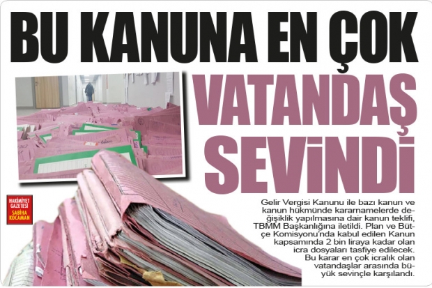 Gelir Vergisi Kanunu ile bazı kanun ve kanun hükmünde kararnamelerde değişiklik yapılmasına dair kanun teklifi, TBMM Başkanlığına iletildi. Plan ve Bütçe Komisyonu’nda kabul edilen Kanun kapsamında 2 bin liraya kadar olan icra dosyaları tasfiye edilecek. Bu karar en çok icralık olan vatandaşlar arasında büyük sevinçle karşılandı.