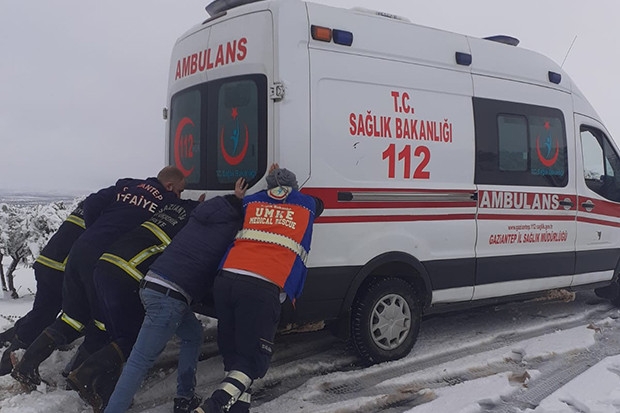 Gaziantep'in Nizip ilçesinde ağıl göçmesi ihbarı üzerine yola çıkan 112 sağlık ve 110 itfaiye ekipleri yoğun kar yağışı ve buzlanma nedeniyle yolda kaldı. Kara saplanan ve patinaj yapan aracı kurtarmaya çalışan itfaiye erleri ve sağlık ekiplerinin yardımına ise mahalleli yetişti. İtfaiye aracını iterek kardan kurtaran vatandaşların, ambulansı itme çabaları ise sonuçsuz kaldı. Uğraşlar sonucu kurtarılamayan ambulans, bir mahallelinin olay yerine getirdiği traktör ile çekilerek, kardan çıkarıldı.