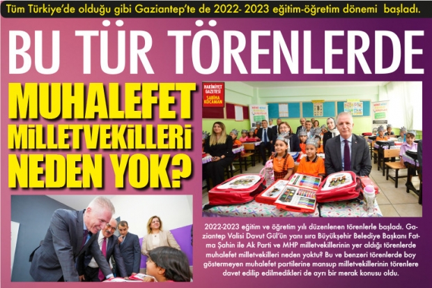 2022-2023 eğitim ve öğretim yılı düzenlenen törenlerle başladı. Gaziantep Valisi Davut Gül'ün yanı sıra Büyükşehir Belediye Başkanı Fatma Şahin ile Ak Parti ve MHP milletvekillerinin yer aldığı törenlerde muhalefet milletvekilleri neden yoktu? Bu ve benzeri törenlerde boy göstermeyen muhalefet partilerine mansup milletvekillerinin törenlere davet edilip edilmedikleri de ayrı bir merak konusu oldu.
