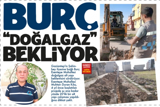 Gaziantep'in Şahinbey ilçesine bağlı Burç Esentepe Mahallesi doğalgaz alt yapı beklentisini sürdürüyor. Esentepe Mahallesi Muhtarı Duran Kılıç, 4 yıl önce başlatılan projede şu ana kadar yüzde 20'lik bir alt yapı çalışması yapıldığına dikkat çekti.