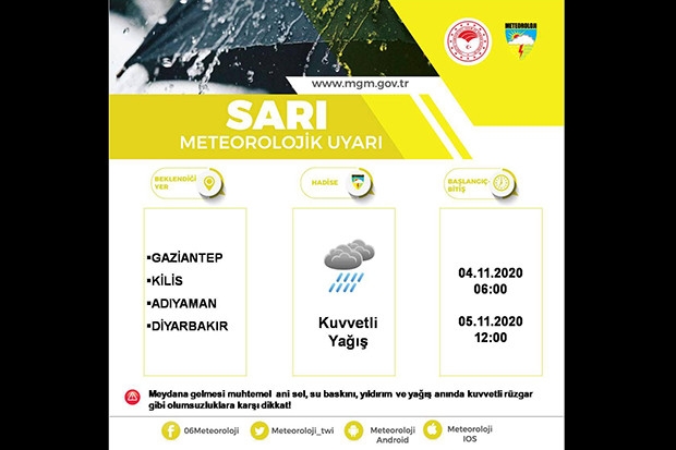 Meteoroloji Genel Müdürlüğü tarafından yapılan son değerlendirmelere göre 04 Kasım Çarşamba günü öğle saatlerinden başlayarak, 05 Kasım Perşembe günü öğle saatlerine kadar Gaziantep il genelinde hava şartlarının sağanak ve yer yer gök gürültülü sağanak yağışlı geçeceği tahmin ediliyor.