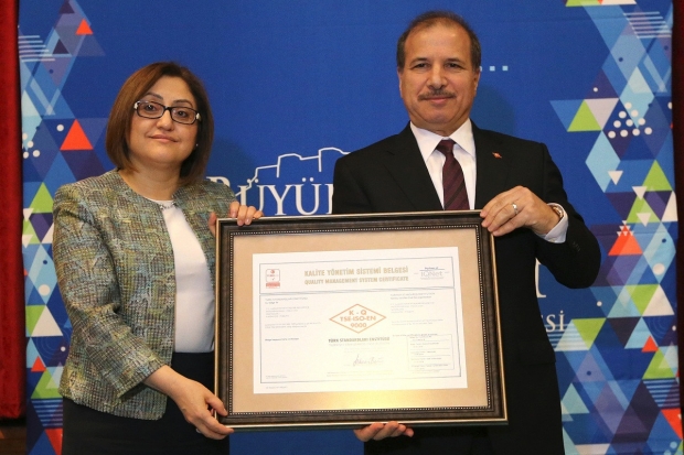 Gaziantep Büyükşehir Belediyesinin almaya hak kazandığı “TS EN ISO 9001:2008 Kalite Yönetim Sistemi Belgesi” törenle takdim edildi.