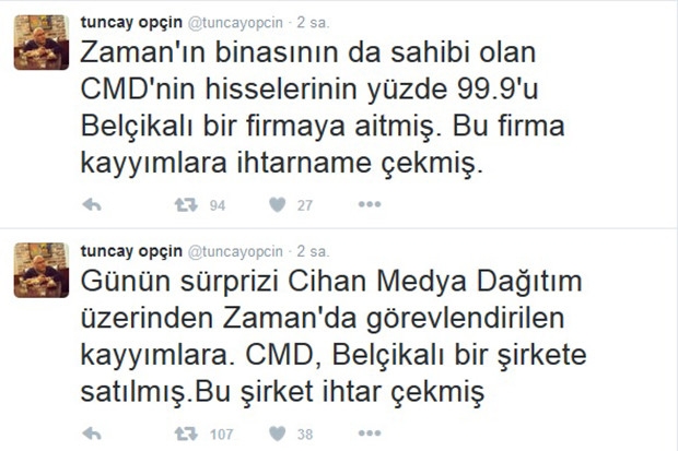 Opçin, ihtilaf halinde Belçika mahkemelerinin yetkili olduğunu da belirterek "Kayyımlar gereğini yapmazsa mesele, şirketin merkezi olan Belçika'da mahkemeye taşınır." dedi. Opçin Twitter'dan şunları yazdı: "Günün sürprizi Cihan Medya Dağıtım üzerinden Zaman'da görevlendirilen kayyımlara. CMD, (Cihan Medya Dağıtım) Belçikalı bir şirkete (CASCADE Investment NV) satılmış. Bu şirket ihtar çekmiş. Zaman'ın binasının da sahibi olan CMD'nin hisselerinin yüzde 99.9'u Belçikalı bir firmaya aitmiş. Bu firma kayyımlara ihtarname çekmiş. İhtarnamede, kayyımların abone dağıtımına karışamayacağı belirtilmiş. Kayyımlar bu ihtarnamenin gereğini yapmak zorunda. Kayyımlar gereğini yapmazsa mesele, şirketin merkezi olan Belçika'da mahkemeye taşınır. Şirket sözleşmesinde, ihtilaf halinde hangi mahkemelerin yetkili kılındığı herhalde açıklanmıştır. Kayyımlara rahat yok. Bu arada özgür basına; Meydan, Özgür Düşünce, Yarına Bakış, Yeni Asya, Cumhuriyet ve Birgün'e sahip çıkalım" ifadelerine yer verdi.