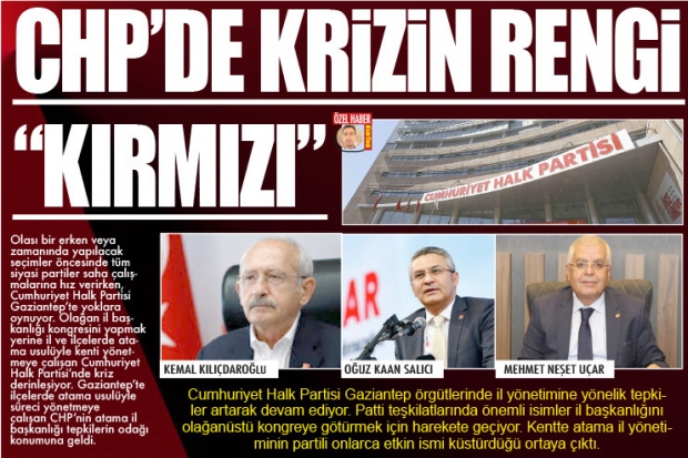 Cumhuriyet Halk Partisi'nde ilçe başkanlığı atamalarıda çok sayıda partili isme söz verildiği ortaya çıktı. Söz verilen isimlerin daha sonra il yönetimine yönelik sert tepki gösterdikleri ve olağanüstü kongre kararı için harekete geçtikleri öğrenildi. CHP Gaziantep İl Başkanı Neşet Uçar'ın süreçte ilçe başkanlığı için çok sayıda isme söz verdiği, verilen sözlere rağmen farklı isimlerin ilçe başkanlıklarına atandığı iddia edildi. İlçe başkanlıklarına atanan isimlerin seçimler öncesinde saha çalışmalarında etkin olamayacakları, CHP'nin ülke genelinde başarılara imza atmasına rağmen Gaziantep'te yine başarısızlığın ortaya çıkmasında korkulduğu ifade edildi.