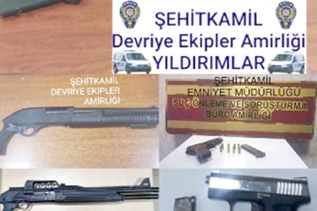 Gaziantep Emniyet Müdürlüğü Şehitkamil İlçe Emniyet Müdürlüğü devriye ekipleri tarafından suç ve suçlulara yönelik çalışma yapıldı. Yapılan çalışmada, 2 şahıstan birer ruhsatsız tabanca ile 11 adet fişek, 3 ayrı şahıstan birer ruhsatsız pompalı av tüfeği ve üç adet tüfek fişeği olmak üzere toplam 2 ruhsatsız tabanca, 3 adet tüfek ve 14 fişek ele geçirildi.