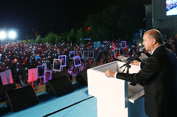 Cumhurbaşkanı Recep Tayyip Erdoğan, "Darbeci soysuzlar da onları üzerimize salanlar da bundan sonra rahat yüzü göremeyecektir. Zayıf düştüğümüzü sanarak bir sırtlan gibi üzerimize saldıran ama bu aslanın hala dimdik ayakta olduğunu görünce süklüm püklüm geri çekilenler de yaptıklarının bedelini ödemeye hazır olsunlar" dedi.