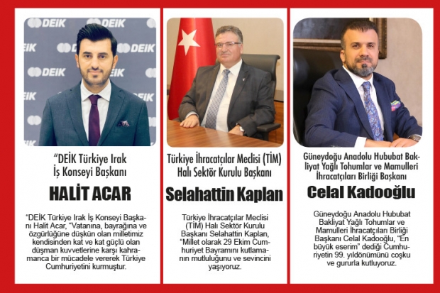 “DEİK Türkiye Irak İş Konseyi Başkanı Halit Acar, “Vatanına, bayrağına ve özgürlüğüne düşkün olan milletimiz kendisinden kat ve kat güçlü olan düşman kuvvetlerine karşı kahramanca bir mücadele vererek Türkiye Cumhuriyetini kurmuştur. Toplumun tüm kesimlerinin top yekûn mücadelesinin eseri olan Cumhuriyetimizin kuruluşunun yıldönümünü coşku, gurur, heyecan ve sevinçle kutluyoruz” dedi.