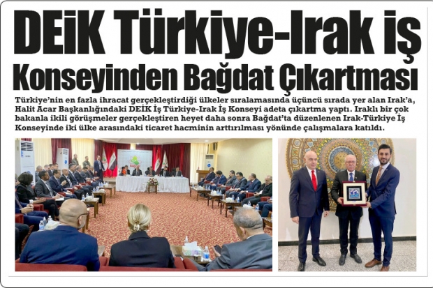Türkiye’nin en fazla ihracat gerçekleştirdiği ülkeler sıralamasında üçüncü sırada yer alan Irak’a, Halit Acar Başkanlığındaki DEİK İş Türkiye-Irak İş Konseyi adeta çıkartma yaptı. Iraklı bir çok bakanla ikili görüşmeler gerçekleştiren heyet daha sonra Bağdat’ta düzenlenen Irak-Türkiye İş Konseyinde iki ülke arasındaki ticaret hacminin arttırılması yönünde çalışmalara katıldı.