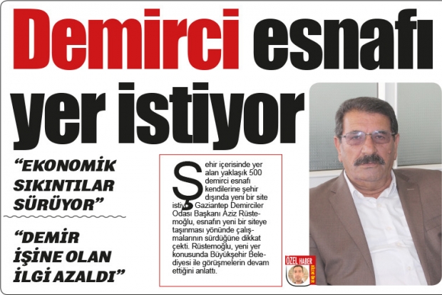 Şehir içerisinde yer alan yaklaşık 500 demirci esnafı kendilerine şehir dışında yeni bir site istiyor. Gaziantep Demirciler Odası Başkanı Aziz Rüstemoğlu, esnafın yeni bir siteye taşınması yönünde çalışmalarının sürdüğüne dikkat çekti. Rüstemoğlu, yeni yer konusunda Büyükşehir Belediyesi ile görüşmelerin devam ettiğini anlattı.