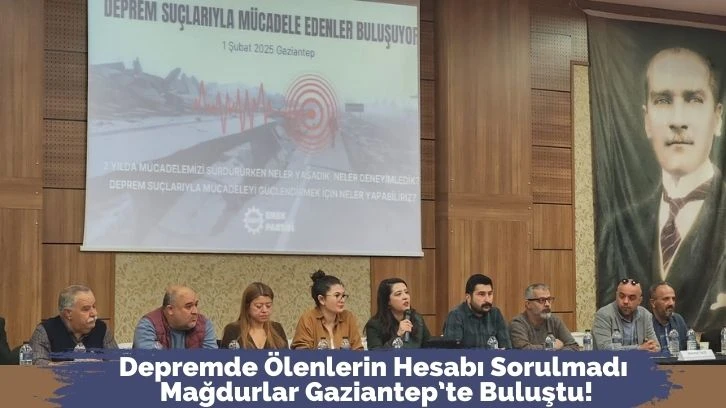 6 Şubat depreminin ikinci yıl dönümüne yaklaşırken, deprem suçlarıyla mücadele eden emek ve meslek örgütleri, hak savunucuları ve deprem mağdurları, Gaziantep’te bir araya geldi. Şehitkamil Kültür Merkezi’nde düzenlenen buluşmada, deprem felaketinin sorumlularından hesap sorulması ve adalet mücadelesinin ortaklaştırılması gerektiği vurgulandı.