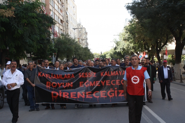 Eski Adliye önünde toplanan eylemciler adın bir basın açıklamasında bulunan DİSK Gaziantep Şube Başkanı Ali Güdücü, “10 Ekim’de Ankara’da Emek, Barış ve Demokrasi Mitingi için toplanmıştık. Saray’ın saltanatı uğruna aylardır dökülen kanlara dur demek, savaşa karşı, barışı savunmak için yollara düştük. Halkların özlemlerini haykırmak, umutlarını yaşatmak için, kandan ve savaştan beslenenlere karşı “Savaşa İnat, Barış Hemen Şimdi!” demek için gelmiştik. Türkiye’nin dört bir yanından, emek, barış ve demokrasi taleplerimizi haykırmak için gelmiş, kadını erkeği, genci yaşlısı, barış türküleriyle birlikte halaya durmuştuk. Türkiye’nin göbeğinde, Ankara Garı’nın önünde, binlerce polisin gözü önünde bombalarını patlattılar. 128 canımızı aldılar aramızdan. Canımızdan can gitti, yüreklerimiz dağlandı. Annelerimizi, babalarımızı, kardeşlerimizi, arkadaşlarımızı, yoldaşlarımızı kaybettik. İki gündür yüreğimiz yanıyor, içimiz kanıyor. Üzgünüz, öfkeliyiz, yastayız ve isyan ediyoruz. Bizler patlama sonrasında canlarımızı kurtarmaya çalışırken, polislerini gaz bombaları ile üzerimize salanlar, yüzümüze sırıtarak “güvenlik zafiyeti” yok diyorlar” şeklinde konuştu.